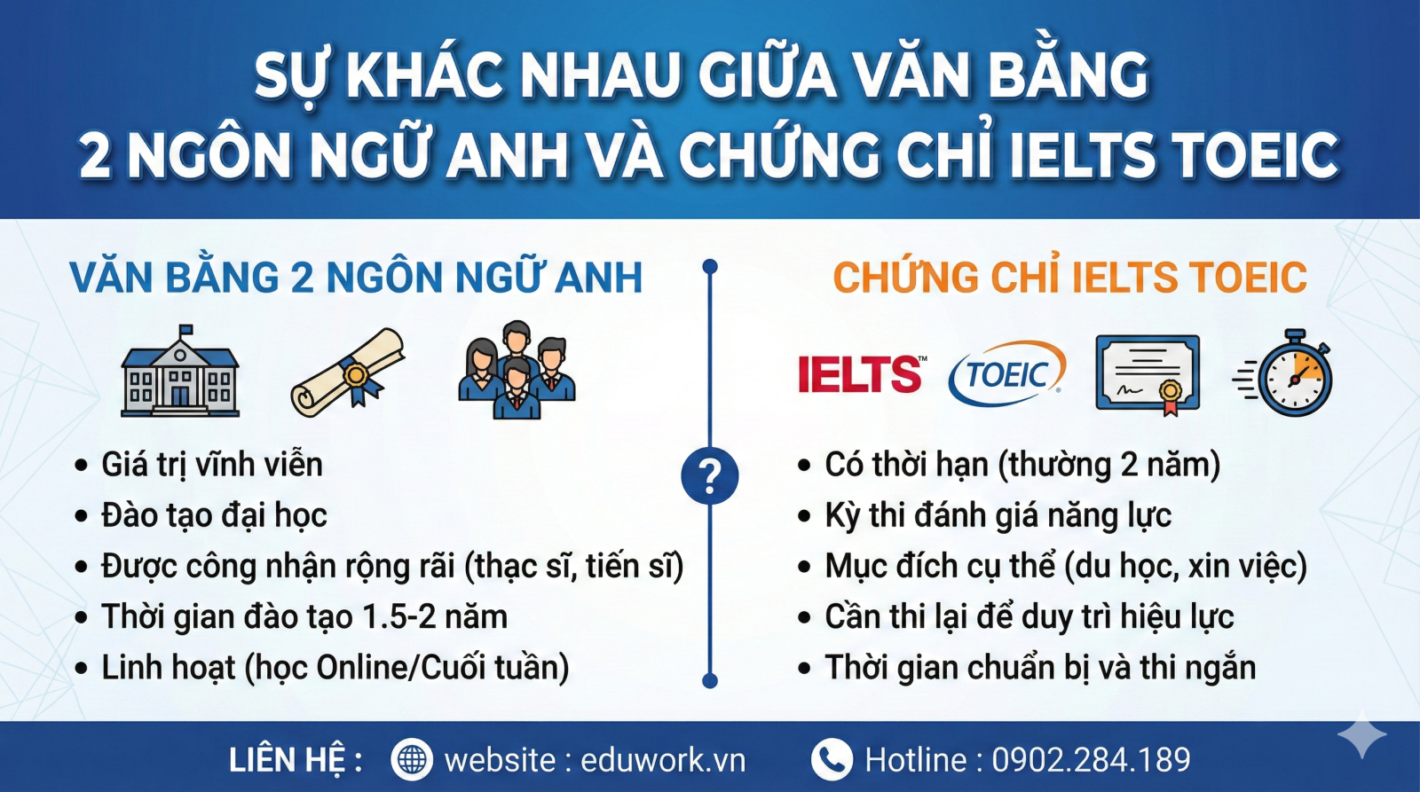 Cùng làm rõ sự khác biệt mang tính chiến lược này: 1. Giá trị pháp lý: Chứng chỉ (IELTS/TOEIC) chỉ là chứng nhận trình độ tại một thời điểm. Văn bằng 2 là một học vị nằm trong hệ thống giáo dục quốc dân, được Nhà nước bảo hộ và công nhận vĩnh viễn. 2. Thời hạn: