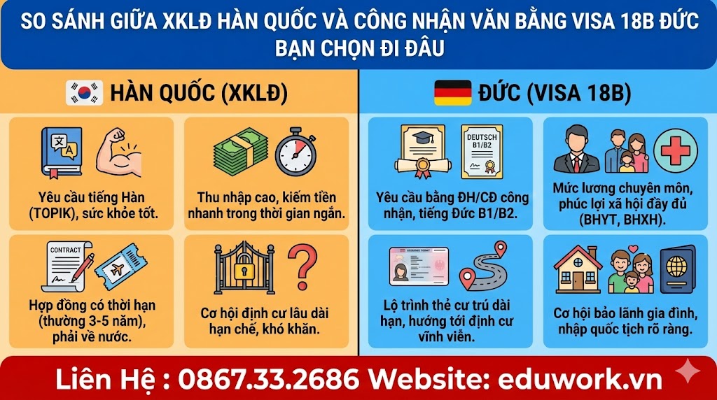 Đứng giữa ngã ba đường: XKLĐ Hàn Quốc thu nhập khủng hay Visa 18b Đức định cư cả gia đình? Bài viết phân tích chi tiết Ưu - Nhược điểm, lương thực nhận và lộ trình tương lai từ chuyên gia di trú hàng đầu.