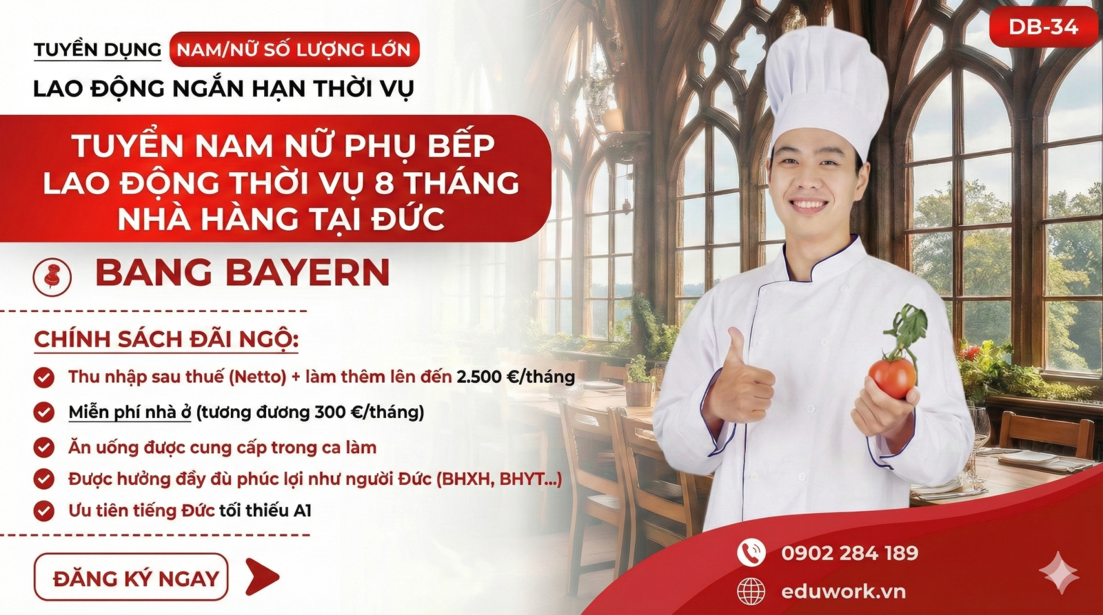 TUYỂN GẤP NAM NỮ 20 - 45T PHỤ BẾP SANG LAO ĐỘNG THỜI VỤ 8 THÁNG TẠI ĐỨC