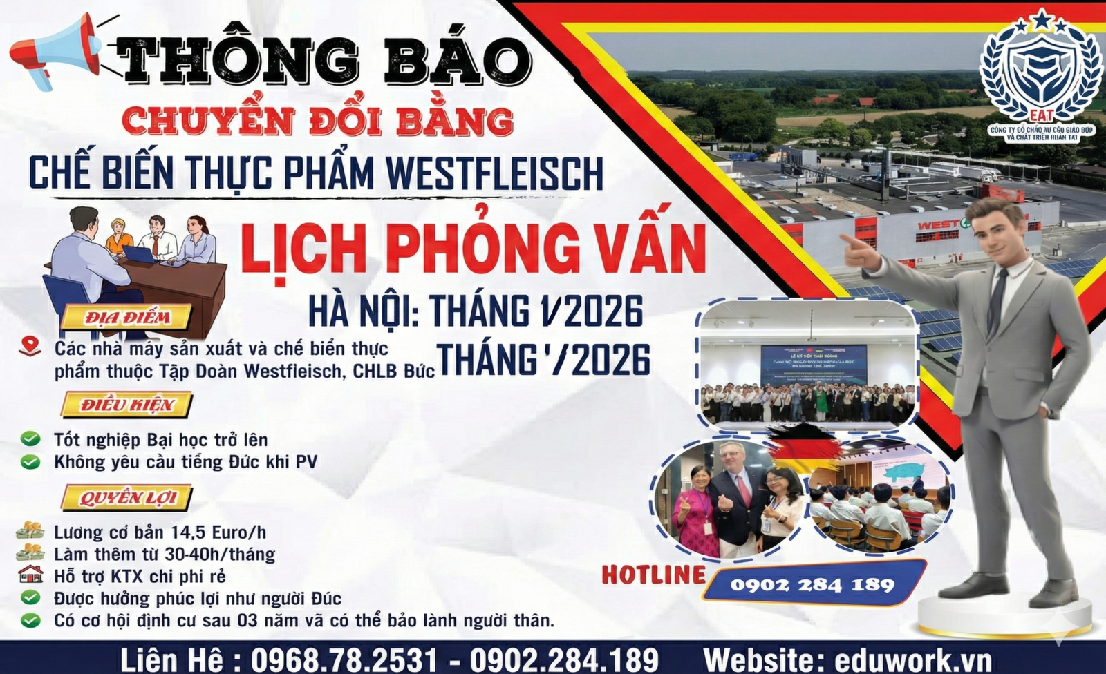 Trong bối cảnh Cộng hòa Liên bang Đức đang "khát" nhân lực trầm trọng, các chính sách thu hút lao động quốc tế đang được nới lỏng mạnh mẽ. Nắm bắt cơ hội này, Eduwork & Công ty Cổ phần Tư vấn Giáo dục và Phát triển Nhân tài đã kết nối và hợp tác trực tiếp để đưa lao động Việt Nam sang làm việc tại các nhà máy của Westfleisch.